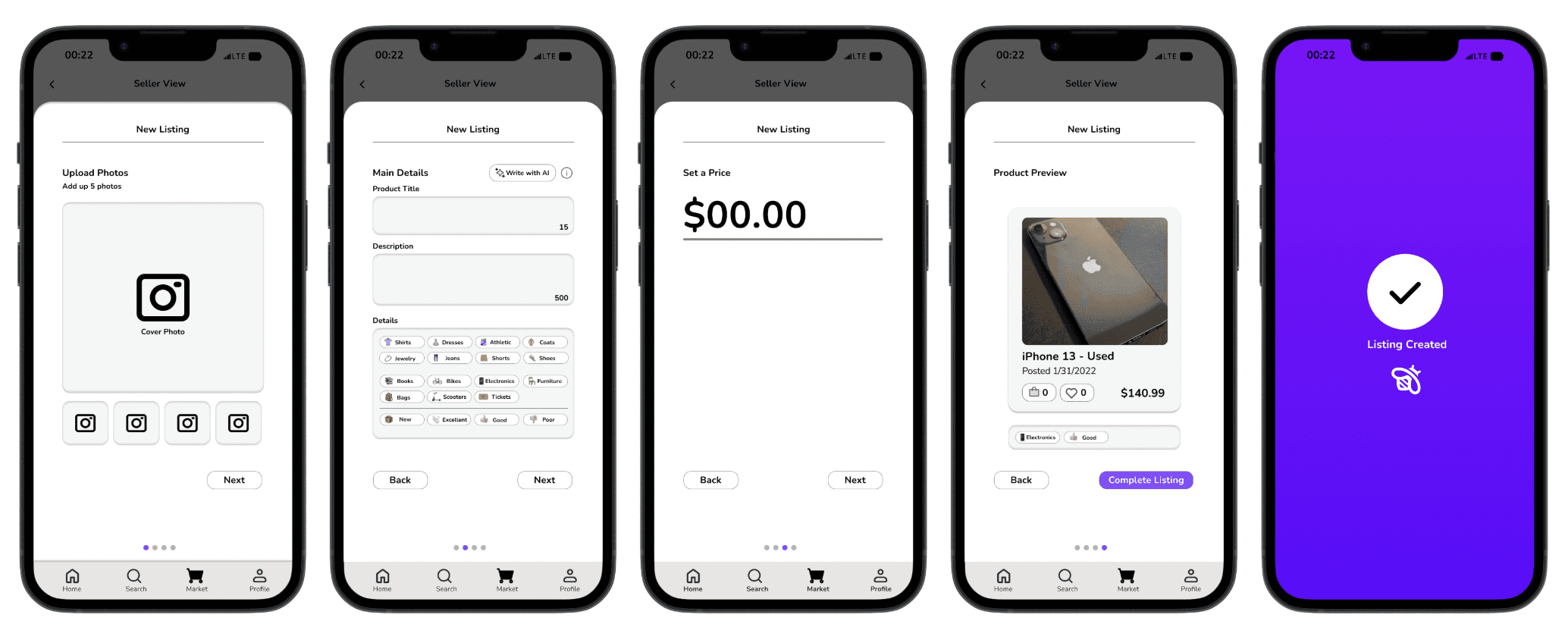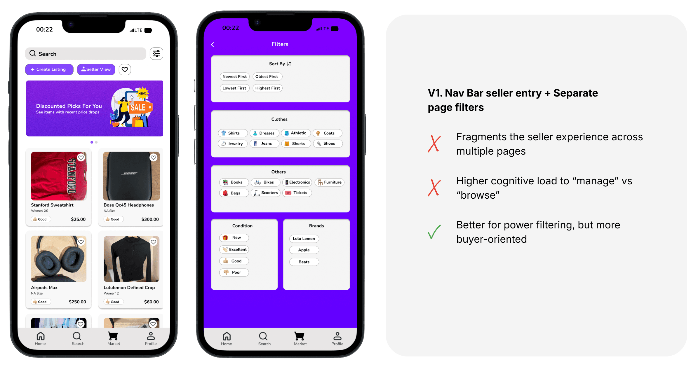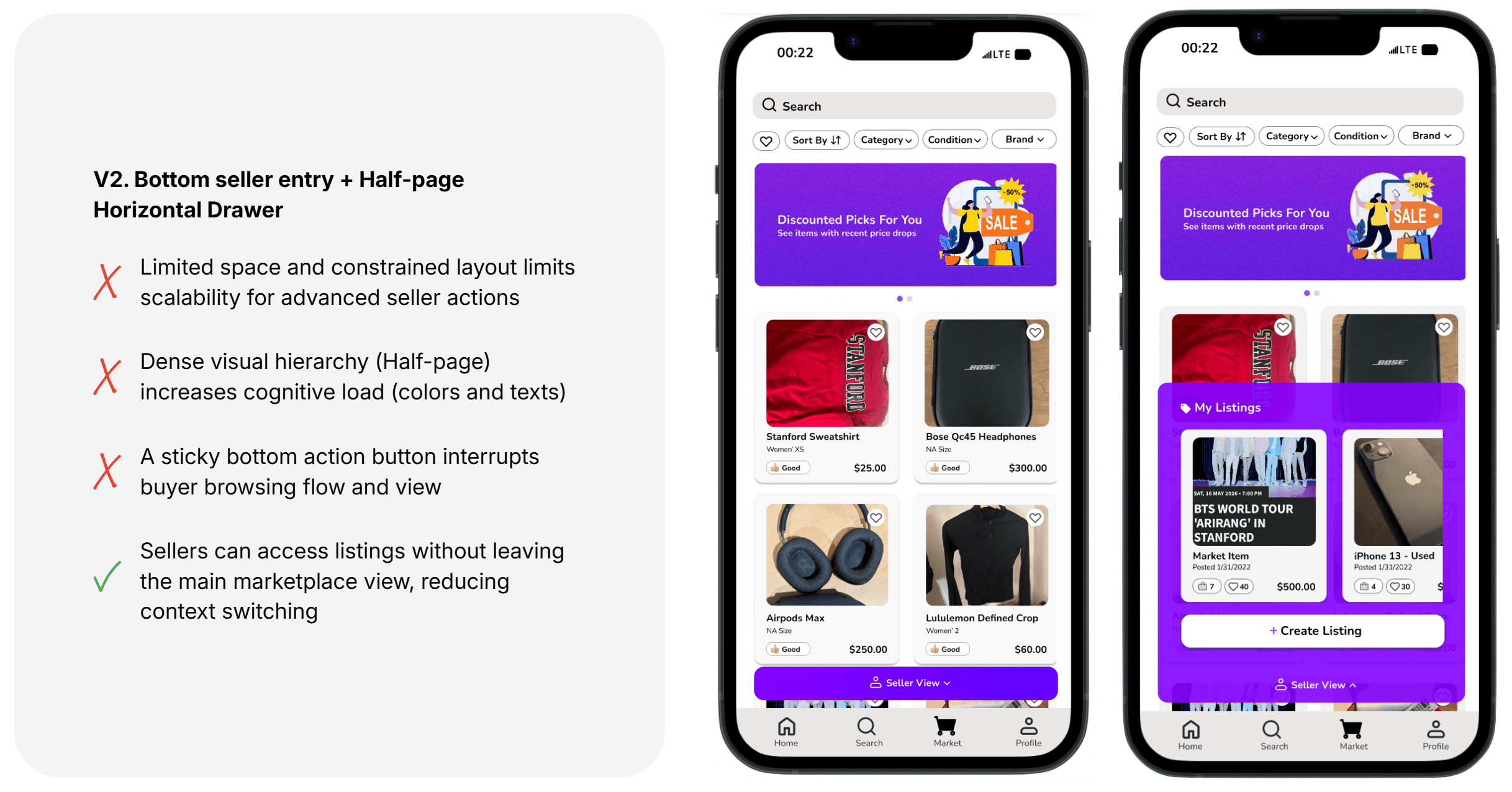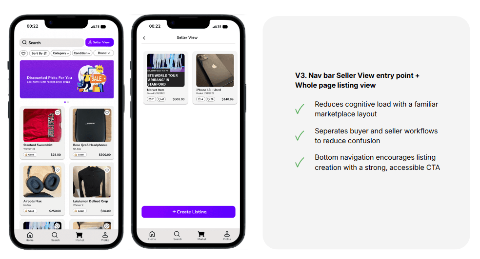 To explore the listing experience and explore page layout, I tested various iterations, including the three presented below. After evaluating these options based on usability, I chose version 3. From a seller’s perspective, Version 3 best supported fast, low-friction listing management by providing persistent access to seller tools without disrupting marketplace browsing. This design balanced seller efficiency with the dual buyer–seller nature of users, making selling feel lightweight, accessible, and repeatable.