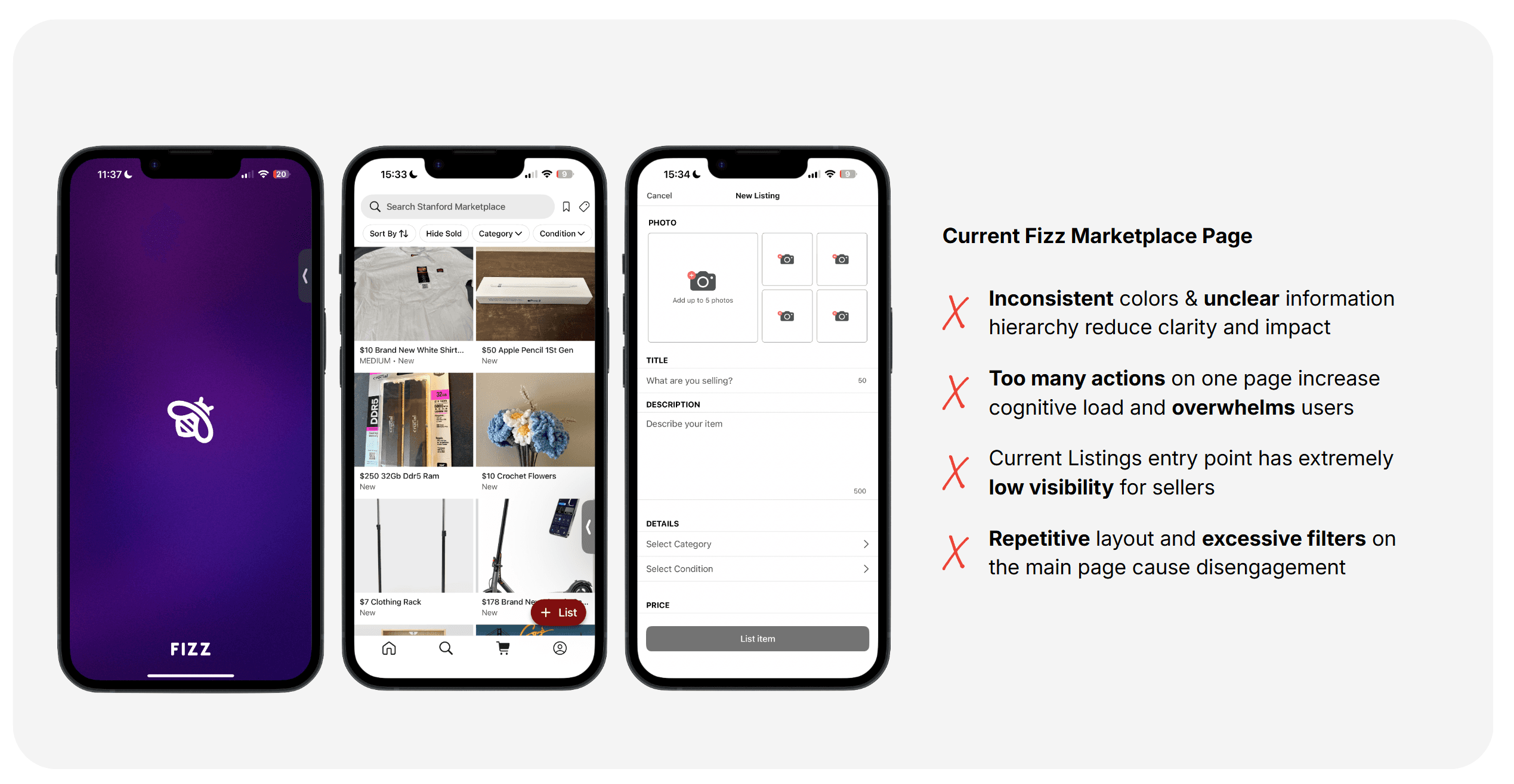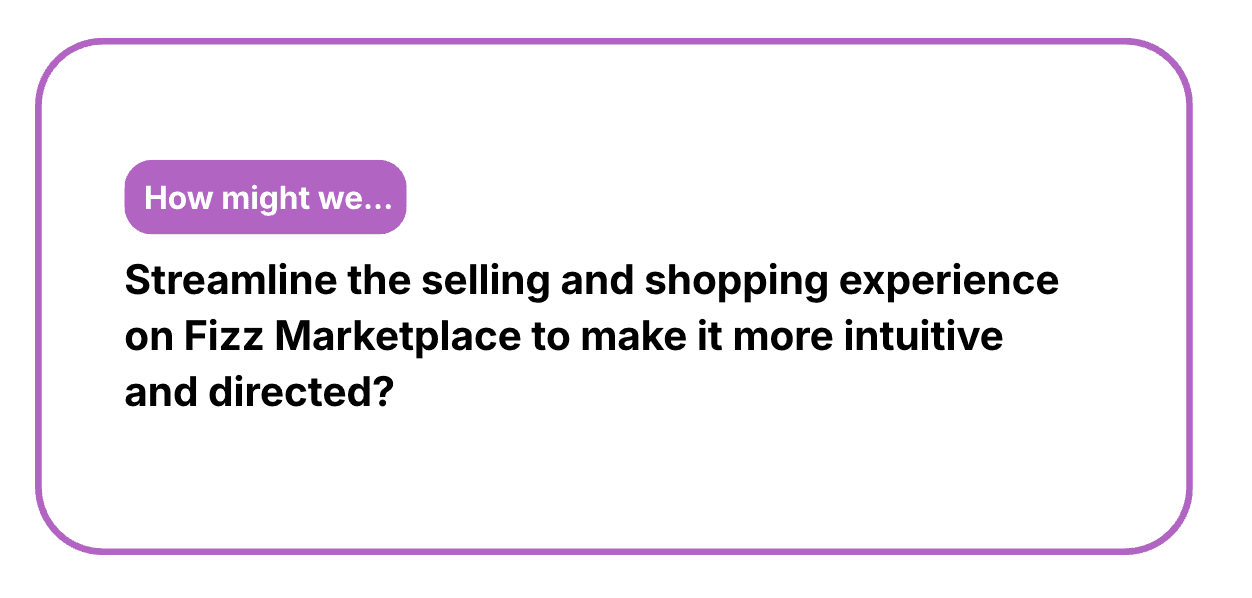 Fizz is a campus-first social marketplace that enables college students to safely buy, sell, and discover everyday items within their local university communities. Our task was to redesign the Fizz Marketplace to improve item discovery and seller confidence by simplifying listing creation and optimizing the main explore experience. This led us to formalize this central focus question: