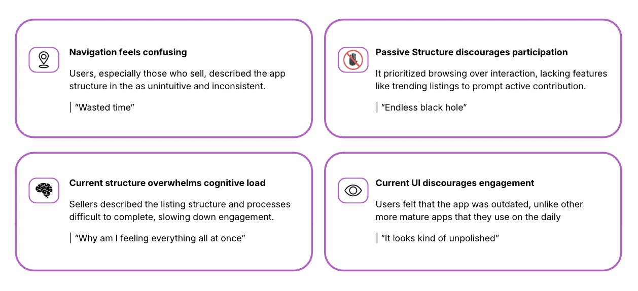 Our goal was to uncover friction in the marketplace discovery and selling journey, and identify the factors that drive—or hinder—user participation. We synthesized our findings into an affinity map, which revealed the following key insights: