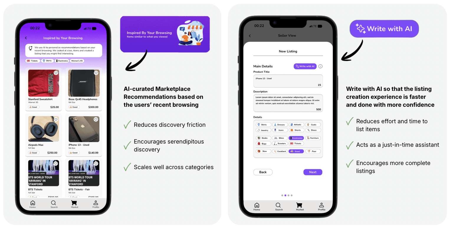 In a collaboration between Fizz and Stanford d.school, the university's design school, I served as a Leading Product Design Consultant on this project aimed at reimagining the Fizz Marketplace to help users discover and confidently sell everyday items within their college communities. While leading, mentoring, and managing designers on the team, I specifically focused on designing a comprehensive listing creation experience for sellers and a updated main explore page that minimized cognitive load and increased engagement.